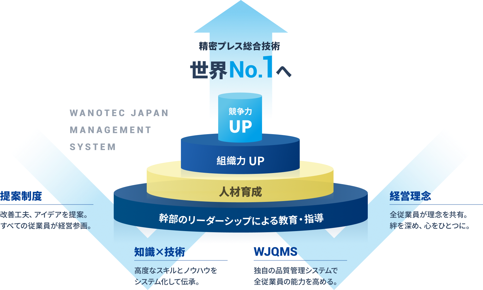 会社が発展するためには、従業員が同じ方向を目指していくことが大切です。価値観と意識の「ベクトルを一つ」にすることで会社経営の強力な推進力になります。ワノテックジャパンの経営目標を達成する方法である「WJMS*」(ワノテックジャパン経営管理システム)と、それを支える3つのコアツールを基準として、全職場共通の教育訓練計画でスキルアップを図っていきます。